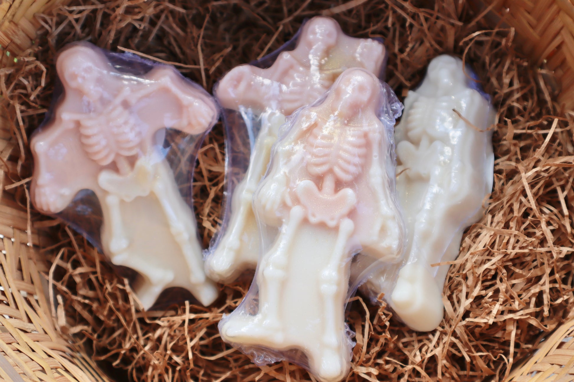 Spooky meets sparkle! These unscented skeleton soaps feature a playful pink kaolin clay swirl and a touch of edible glitter on top, making them a fun, festive addition to your Halloween routine—or a cute treat for gift-giving. Wrapped in shrink wrap for less hassle.
